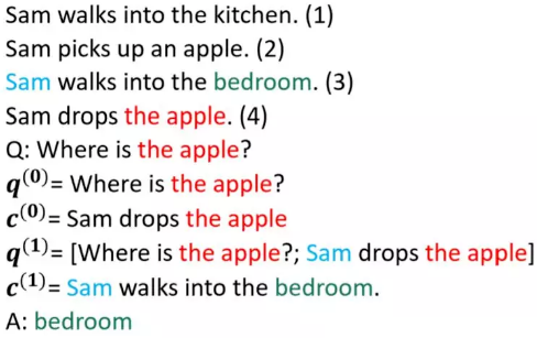 memory 中存储了的键值对,当 key 和 value 相同时,就是最基本的 attention 形式。以 Q&A 任务 [11] 为例能够更好地说明计算,memory 存储了 question(key)---->>answer(value),现新来一个 question,要依据 memory 中的问题-答案对得到答案。起计算方式为:
