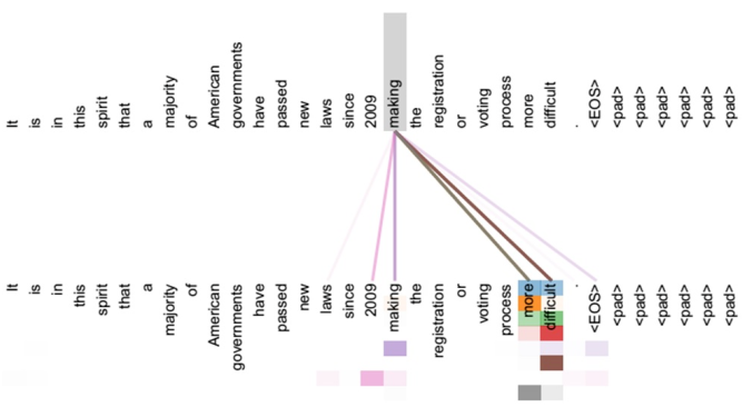 Self-attention 又称为 intra attention,顾名思义,其不是计算 source-target 之间的注意力分布,而是单一计算 source 或 target 内部的注意力分布,也可以看作特殊的 source=target 的情况。其可视化的示例如下图所示,文本序列内部不同词之间的联系。