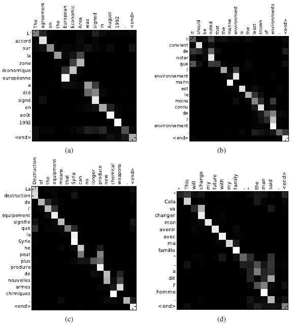 论文还通过对齐分数矩阵可视化所提模型的翻译对齐效果,通过颜色的深浅反应两者之间的联系紧密,这也成为后面应用注意力机制解决其他问题的常用实验结果分析方法。