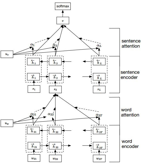 Hierarchical attention (层次注意力)由文献 [9] 提出,由词级别、句子级别注意力机制组成,在文档级别的任务上,往往由多篇章、多句子、多词语组成,Hierarchical attention 能够更好捕获 global 和 local 的信息。