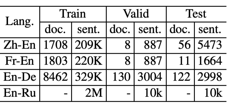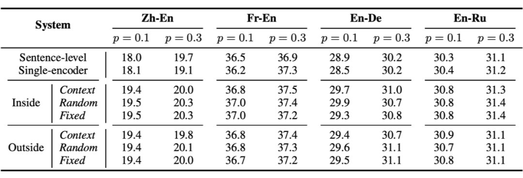 例如,在小数据集上(IWSLT 等)合理地调整 dropout 的阈值能够明显的改善翻译质量。同时研究者发现在一些任务中,BLEU 值的提升不仅仅来自于多编码器提供的额外源语相关信息,还来自于鲁棒性训练,额外的编码器可以看作一个噪音生成器来提供更多的训练信号。因此,研究者通过在一些篇章级翻译任务上对多编码器结构进行实验,进一步证实这个观点。