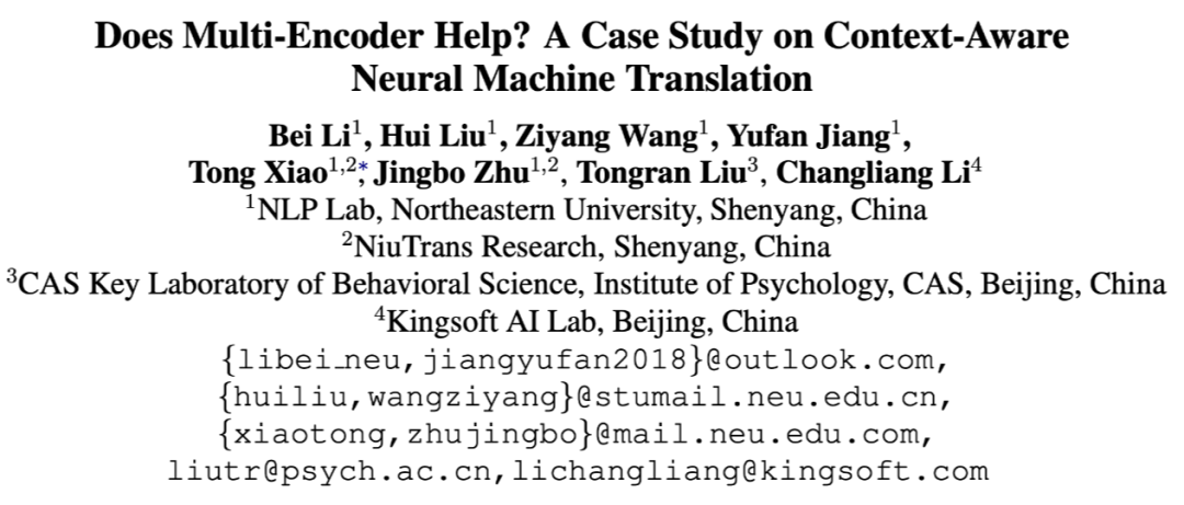 论文标题:Does Multi-Encoder Help? A Case Study on Context-Aware Neural Machine Translation