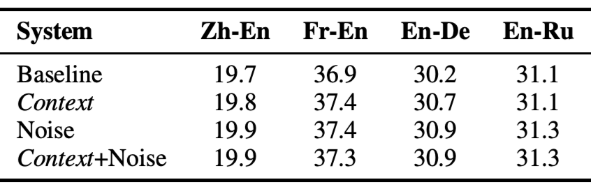 4. 随机上下文和固定上下文并没有提供真实的上下文信息,却得到了与真实上下文相似的提升。这里进一步验证了 BLEU 值的提升并不是来自于额外的上下文信息,而是类似于引入了噪声信号,起到了正则化的作用。