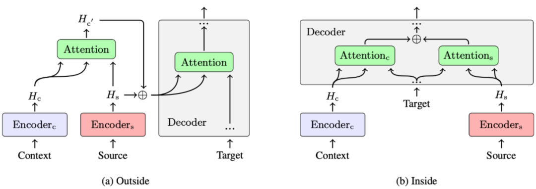 在多编码器结构中,根据解码端对源语表示与上下文表示的集成方式,可以大致分为内部集成(Inside Integration)和外部集成(Outside Integration)两类。其中,外部集成 [5] [7] [8] 是指将源语编码器和上下文编码器的编码结果在送入解码器之前进行融合,得到一个统一的表示,具体融合方法可以采用注意力操作和门控的方式。