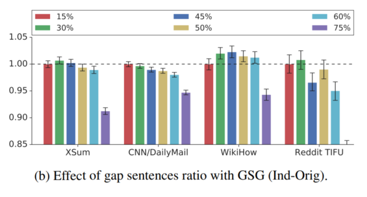 上图显示了不同的选取间隔句子比例带来的不同效果, 最佳性能的 GSR 低于 50%。间隔语句为 15% 的模型在 CNN / DailyMail 上的 ROUGE 得分最高,而XSum / Reddit TIFU 和 WikiHow 分别为 30% 和 45% 时表现更好。