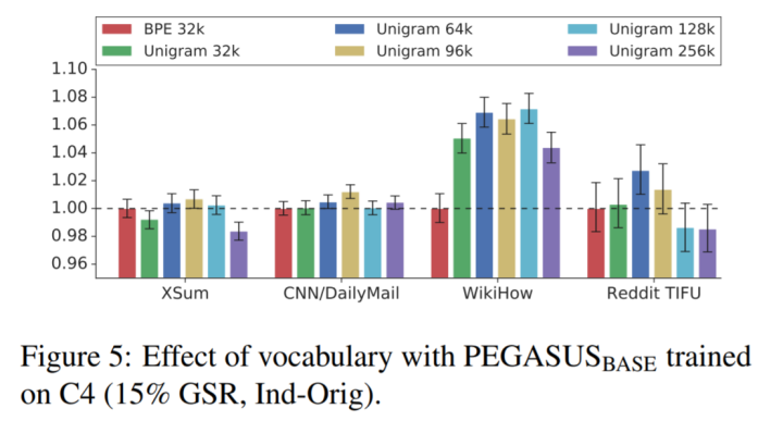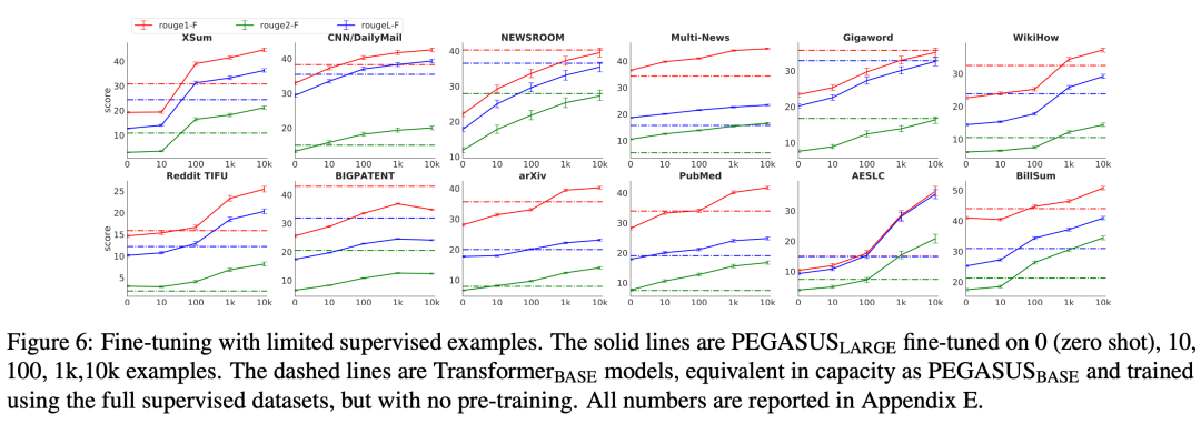 图 6 显示的是 low-resource 微调的结果。实线是在 0(zero-shot),10,100、1k,10k 的示例。虚线是 Transformer-base 模型,其大小与 PEGASUS-base 相同,并且经过完整的监督数据集训练,但无需预训练。