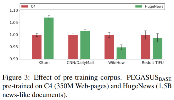 图 3 可以看出,使用 HugeNews 来 pre-train 的模型在使用前两个数据集 fine-tune 之后效果更好,在后两个数据集反之。说明预训练预料如果和下游任务接近,那效果会更好。(这不是很显然的吗。。。