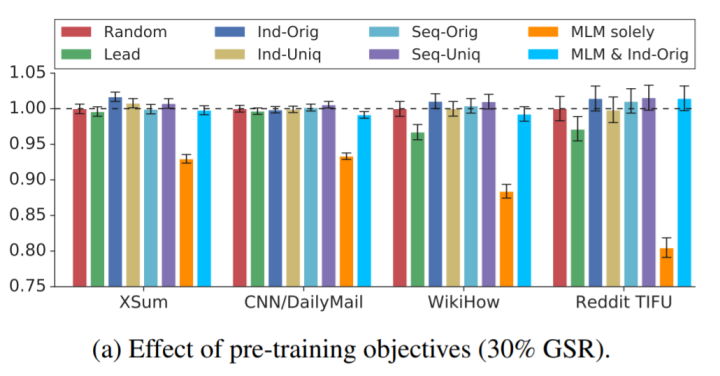 图4(a)对比了 6 种不同的 GSG 策略,Ind-Orig 获得了最佳性能,其次是 Seq-Uniq。Ind-Orig 和 Seq-Uniq 在四个下游数据集始终是最好的(或相似的) “Random” 和 “Lead” 在两个新闻数据集上的表现都不错,但是在两个非新闻数据集上,表现并不好。结果表明选择 principal 句子最适合下游摘要任务。