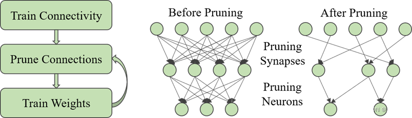 图1.6 三步剪枝训练流程与剪枝前后突触、神经元示意图