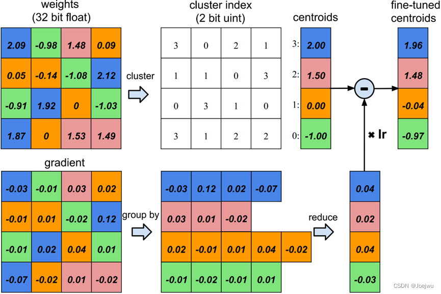 图1.2 Deep Compression中通过聚类完成权值量化与微调示意图[44]