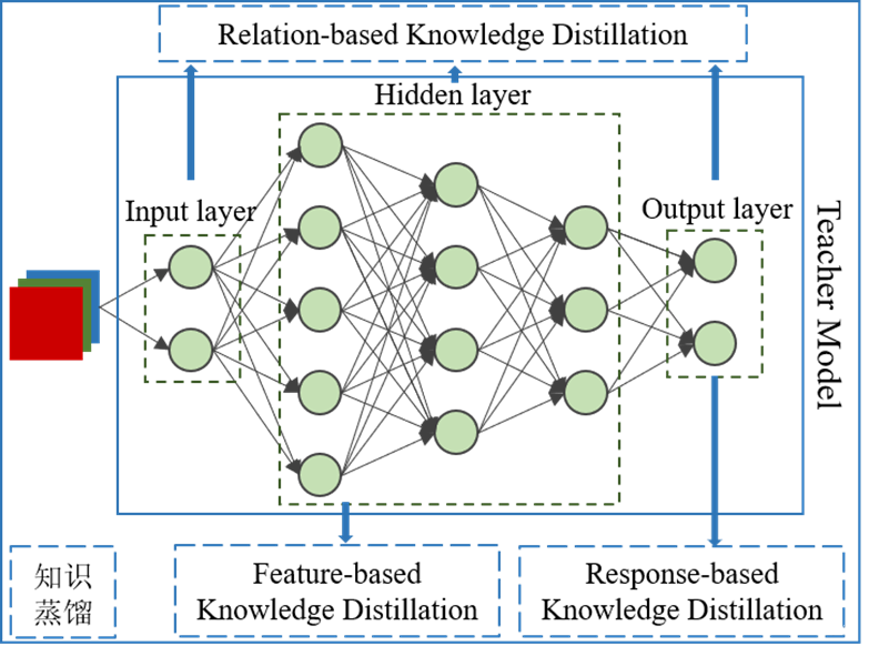 最早是由Hinton等人在2015年提出该方法[125],创新性地提出了一个带有蒸馏温度T的Softmax函数来软化教师模型逻辑层的输出,使得学生模型的监督信息一部分来自教师模型的软标签,另一部分来自原训练数据的硬标签,调整软标签的权重系数来改变教师模型对学生模型的指导作用,最终在分类网络上实现了较好的蒸馏效果。Hinton等人提出的该蒸馏方法属于基于响应的蒸馏,随后在该工作的基础上,又陆续有研究人员提出了基于特征的以及基于关系的蒸馏方法,这三种蒸馏方法之间的关系如图1.8中所示。