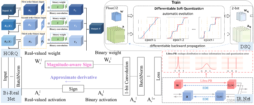 第三类二值神经网络的优化方案是降低二值神经网络训练过程中反向传播时的梯度误差。可以看到,与普通的全精度神经网络类似,二值网络的训练同样依赖于反向传播过程中梯度的更新,但由于二值化操作中所用的符号函数不可导的属性,所以在反向传播过程中大多采用了直通式估计器[53]STE(Straight Though Estimator)来近似符号函数的梯度值(关于STE的原理与使用将在第二章中详细介绍),但这种梯度近似无疑是不准确的,存在显著的梯度不匹配问题,进而导致二值神经网络的训练效果更差,严重影响推理精度。鉴于此,Liu等人提出的Bi-Real Net中提出了一种自定义的ApproxSign函数来近似传统的符号函数进行反向传播中梯度值的计算[54];Darabi等人提出的BNN+(Binary Neural Networks +)中对符号函数的梯度进行近似[55],并采用一个正则化函数来激励二值周围的可学习权值。此后,Gong等人提出一种可微分的量化方案,称之为可微分软量化(DSQ),通过软量化替换传统的量化操作[56],进而较好的解决了STE中梯度不匹配的问题;Qin等人的IR-Net中通过考虑在量化网络训练过程中不同阶段的需求不一致[57],提出了一种自适应误差衰减估计器,较好地平衡了梯度误差的降低幅度与权值参数的更新能力。其中部分二值神经网络的优化处理流程如图1.3中所示。