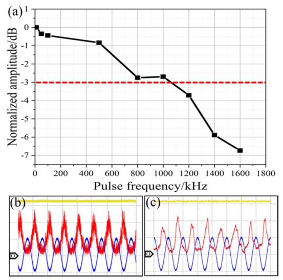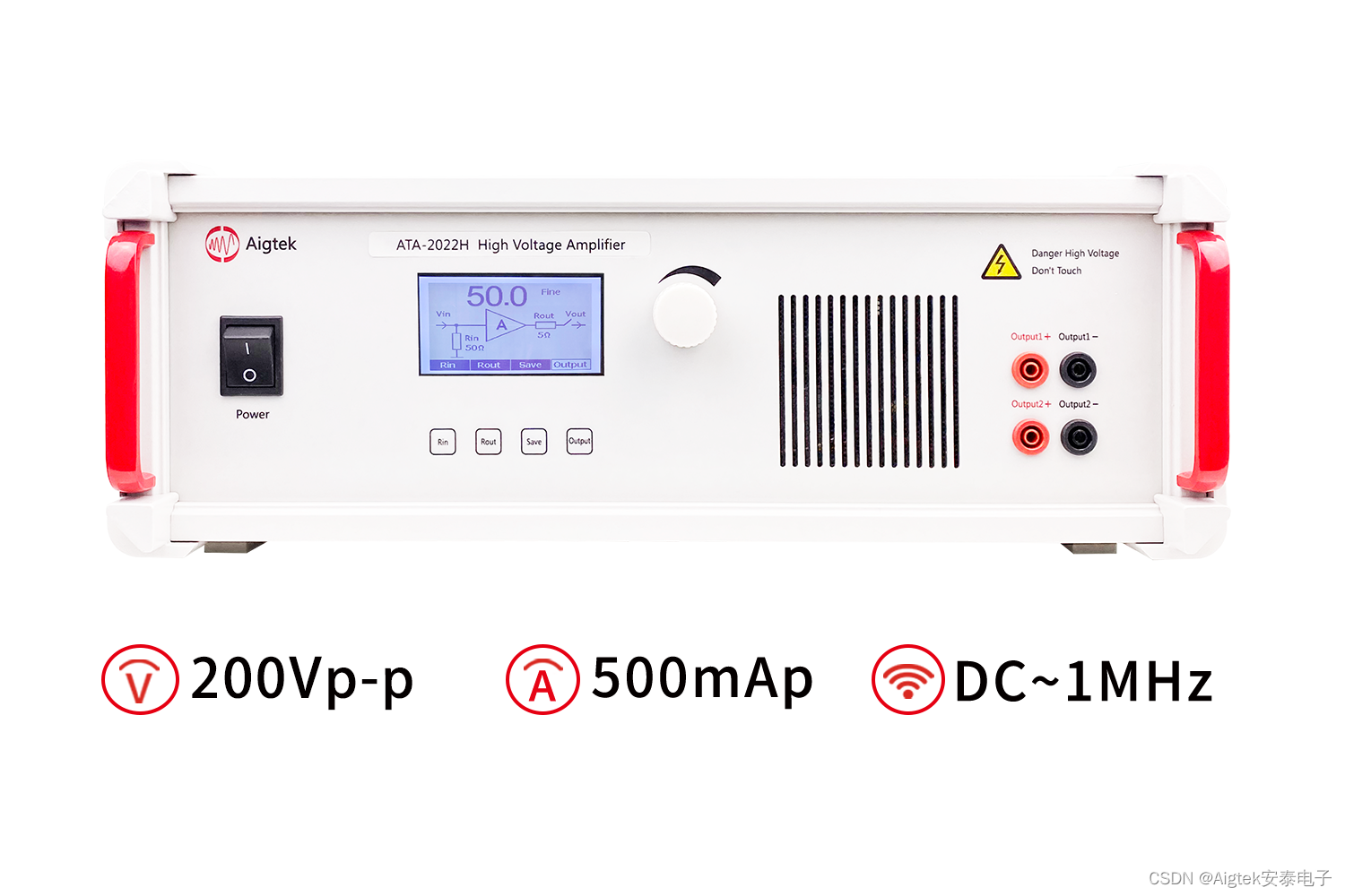 从幅频特性相应曲线来看,由于ATA-2022H的带宽是1MHz,在1MHz的频率范围内,该设备的输出波形均能满足实验要求,幅度、形状不会出现扭曲变形;在高于1MHz时,输出波形已经出现扭曲变形。因此测试实验结果表明,系统的最高幅频特性响应曲线是1MHz,受制于ATA-2022H的性能。