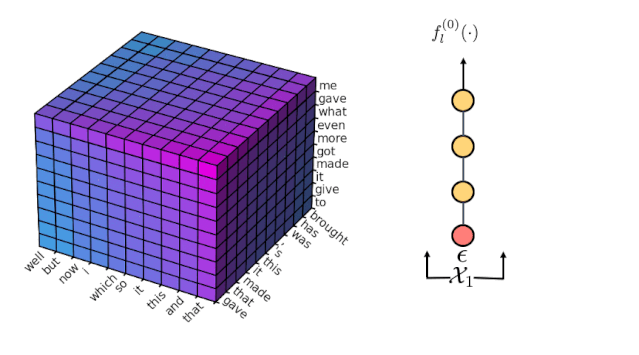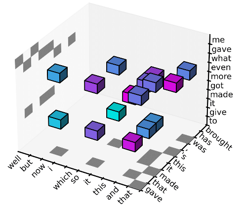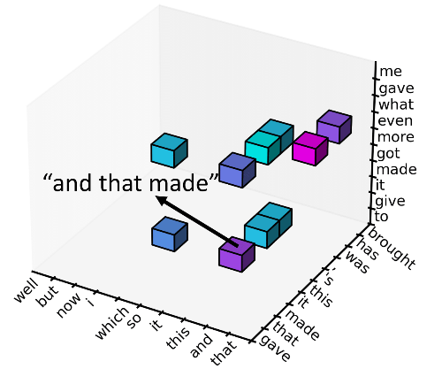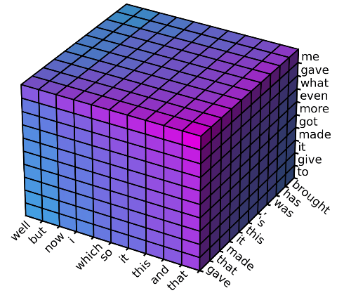 最后,我们使用一个 2 阶的 Markov 模型 去过滤掉每个位置不太可能的 trigram,使得解空间缩小为每个位置只考虑 10 个最可能的 trigram,可以从下图中的 10 个小立方看出。