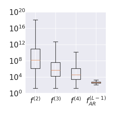 与 beam search 相比,cascaded decoding的另一个优势是在搜索过程中考虑了非常多的序列。虽然每个位置只考虑了 个 n-gram,但考虑的序列个数最多是以序列长度的指数增长的:比如如果每个位置只考虑 个 unigram,那么对于长度为 的序列就考虑了 个可能的序列。下图中我们用一个 box plot 展示实际能够考虑的序列个数。