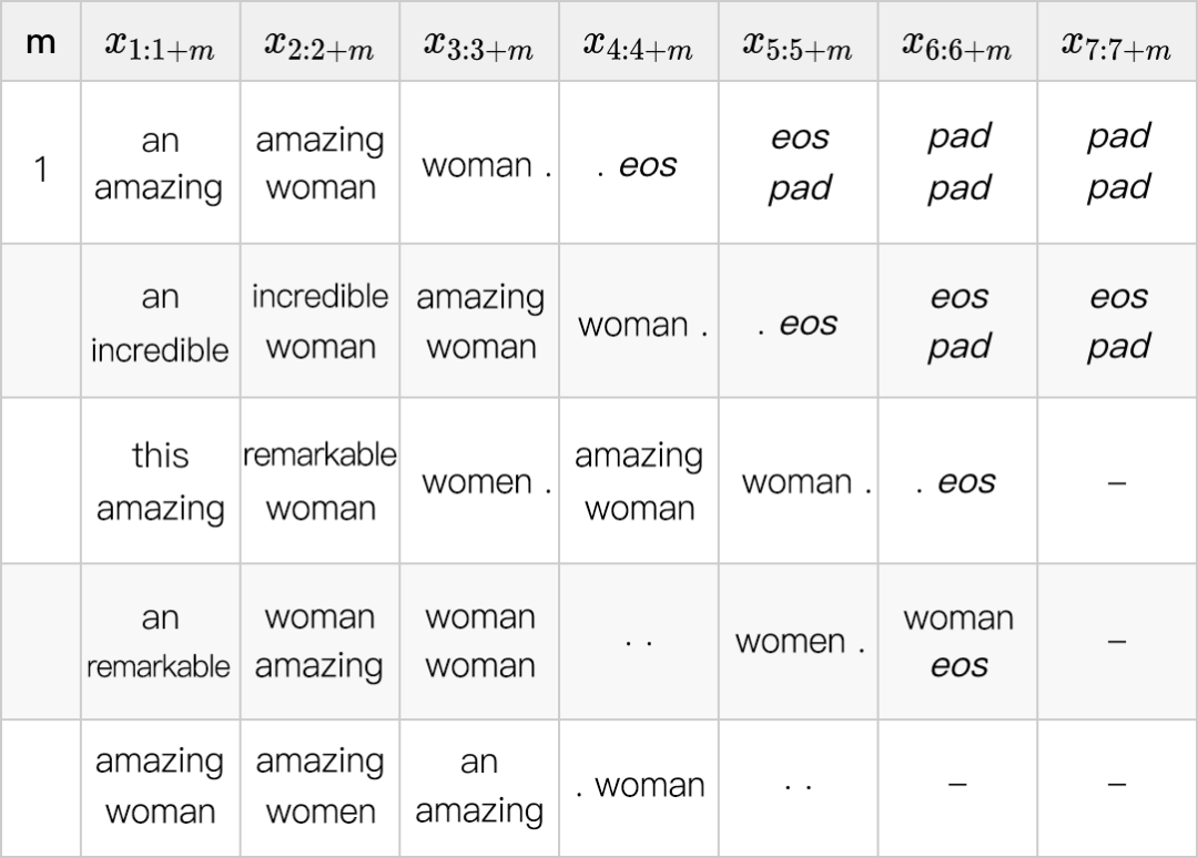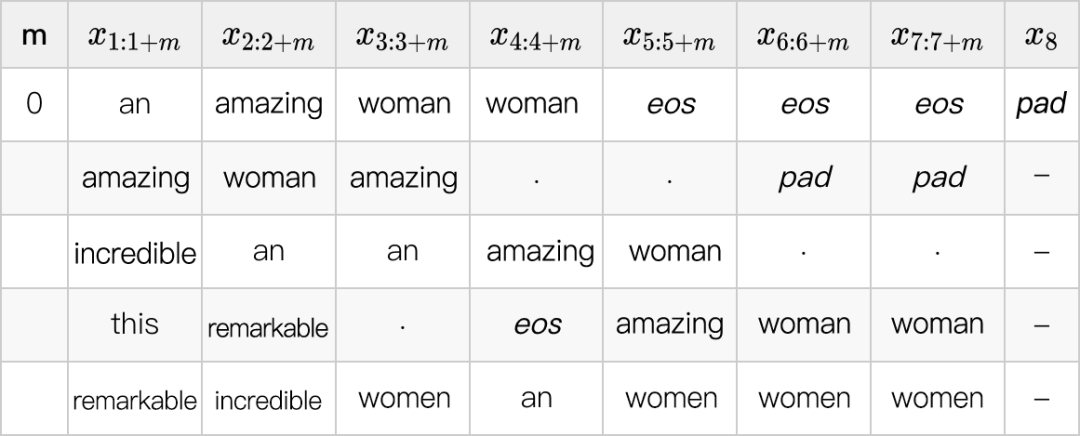 首先,我们使用一个 0 阶模型,并在下表中展示出每个位置最可能的 unigram。如果我们只使用一个 0 阶模型(non-autoregressive),那么得到的解将会是“an amzing woman woman eos”(第一行),重复了单词“woman”,这也是 non-autoregressive 模型的常见问题。