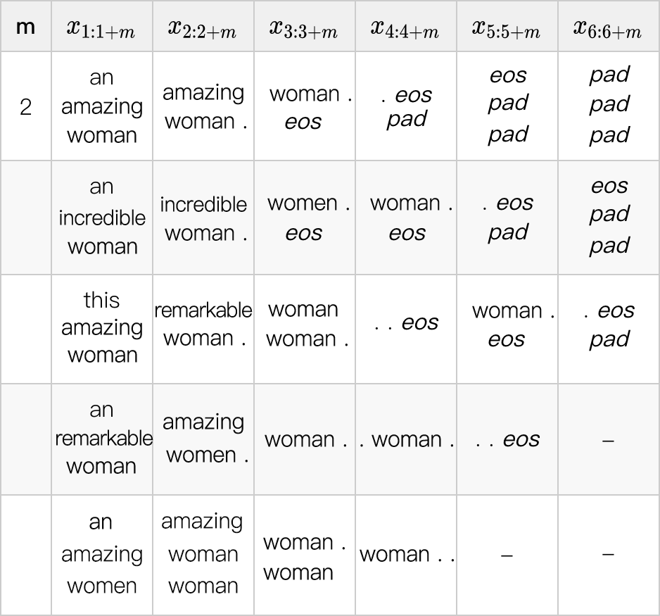 下一步,我们使用一个 1 阶模型,并在下表中展示出每个位置最可能的 bigram。现在已经修正了之前的重复问题:按照第一行的最可能 bigram,最可能的解已经是“an amazing women . eos pad pad pad”。