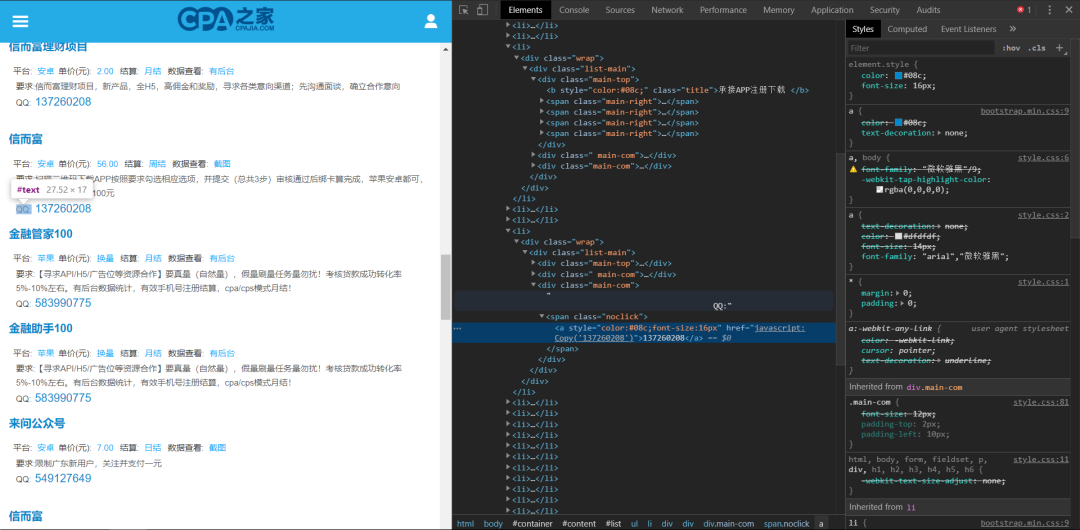 response = requests.post(url=url, data=formdata, headers=kv)html = response.content.decode('utf-8')parse_html = etree.HTML(html)page = parse_html.xpath('//div[@class="wrap"]//div[@class="list-main"]')for li in page:house_dict['项目'] = li.xpath('.//div[@class="main-top"]//b/text()')[0].strip()house_dict['QQ'] = li.xpath('.// div[ @class ="main-com"]//span//a/text()')[0].strip()#print(house_dict)