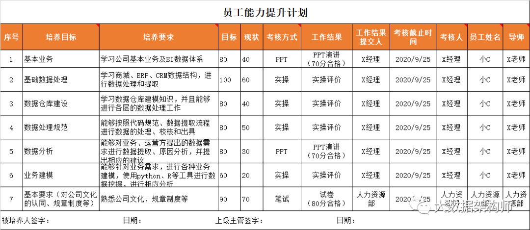 其次,好的组织里都有“员工培养计划”。团队管理者需要帮助每个员工根据部门目标、岗位职责和个人情况,制定中短期的培养计划。培养计划长这个样子: