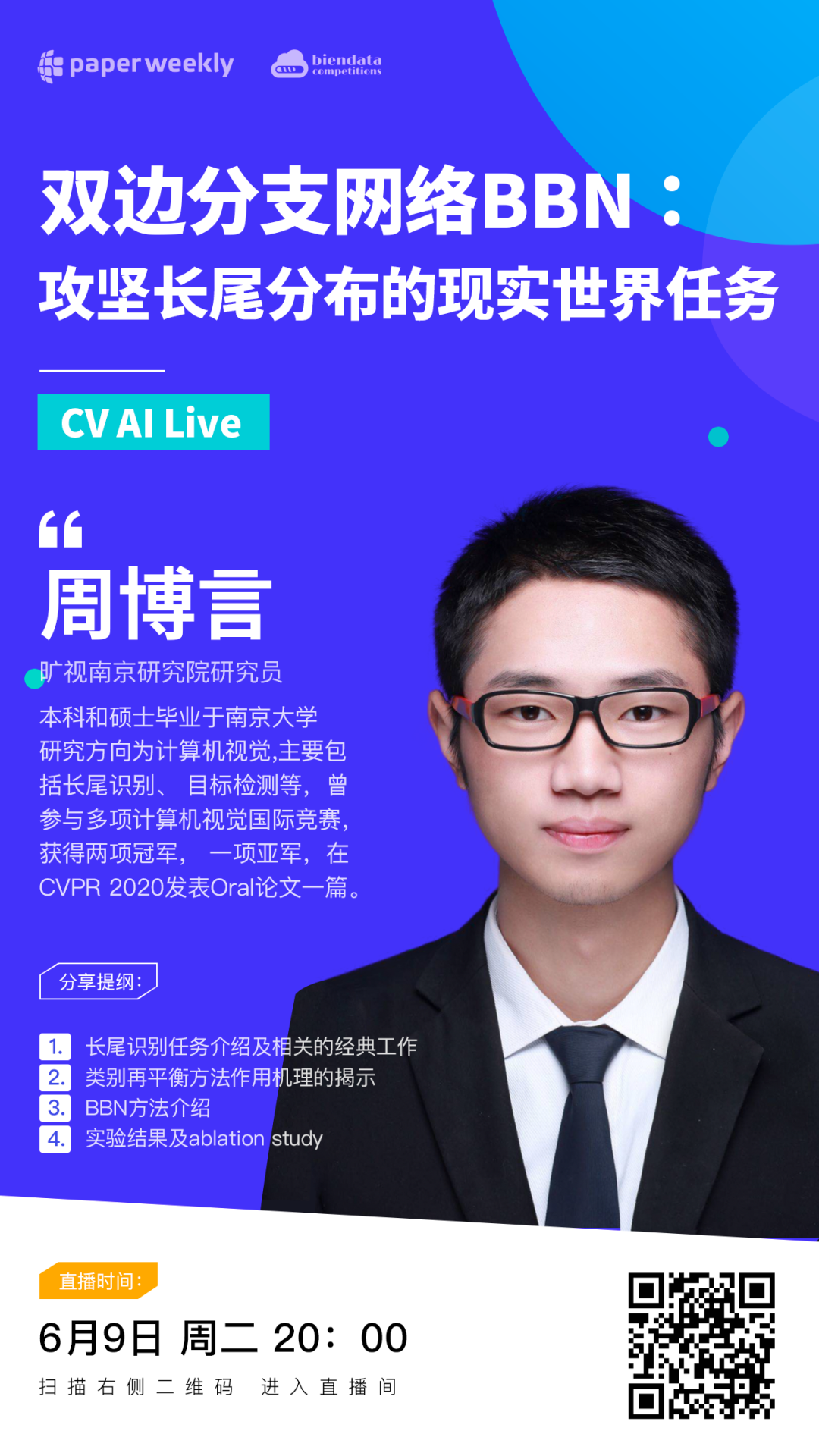 本期 PW Live,我们邀请到旷视南京研究院研究员周博言,为大家带来双边分支网络BBN:攻坚长尾分布的现实世界任务的主题分享。