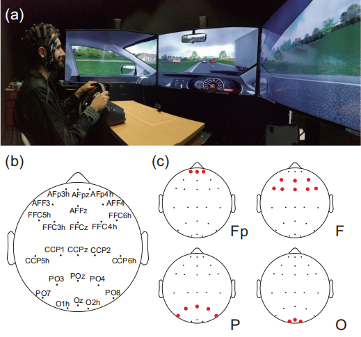 交通状况包括一个双向车道在农村和最低车辆密度,使参与者感到无聊和较少的挑战。如图 1(b) 所示,脑电帽上有 24 个干电极,参照左右乳突的平均值。所有电极均按国际 10-20 系统标准放置,脑电图采集时阻抗保持在 20k 以下。