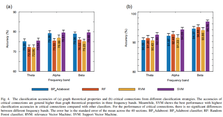 本文分别基于图的理论特性和关键连接进行了疲劳检测。如图 4 所示,支持向量机分类器在两种特征类型中表现都最好。关键连接在驾驶疲劳检测中更具识别性。