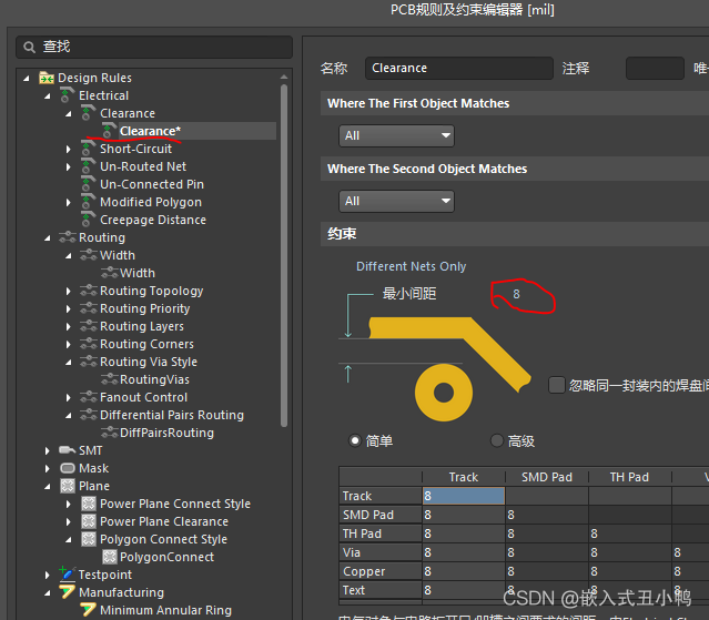 1、Elearance->Clearance,改最小间距,然后回车,下面间距全变了。