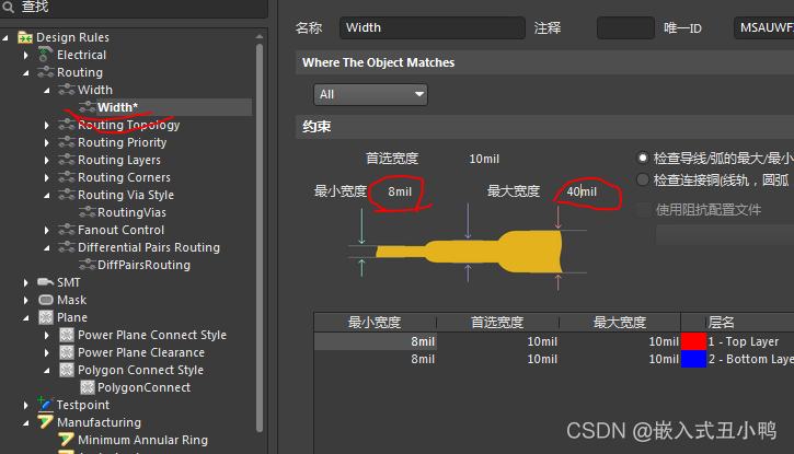 2、改线宽,Routing->Width->Width,最小宽度8mil,最大40mil。