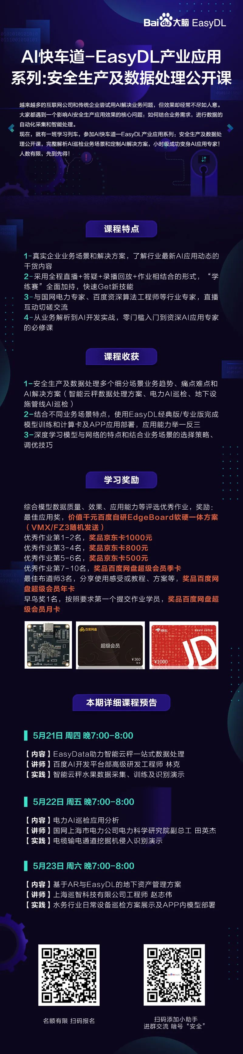 现在,就有一班学习列车,参加AI快车道—EasyDL产业应用系列:安全生产及数据处理公开课,完整解析AI巡检业务场景和定制AI解决方案,小时级成功变身AI应用专家!人数有限,先到先得。