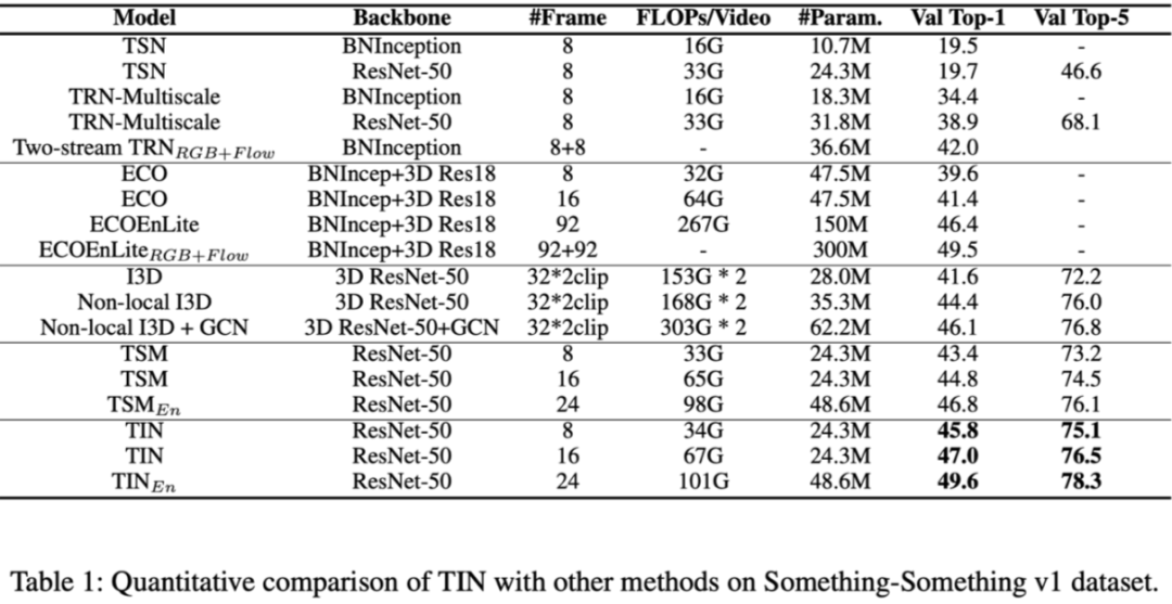 表一对比了在 Something-Something v1 数据集上 TIN 与其他主流模型的性能。在测试性能时每个视频均只采用 1 Crop 进行测试,且分辨率和训练时保持一致。
