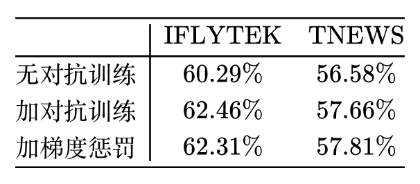 还是前面两个任务,结果如下表。可以看到,梯度惩罚能取得跟 FGM 基本一致的结果。