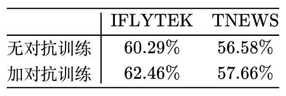 在 CLUE 榜单上,BERT base 模型在这两个数据上的成绩分别是 60.29% 和56.58%,经过对抗训练后,成绩为 62.46%、57.66%,分别提升了 2% 和 1%!