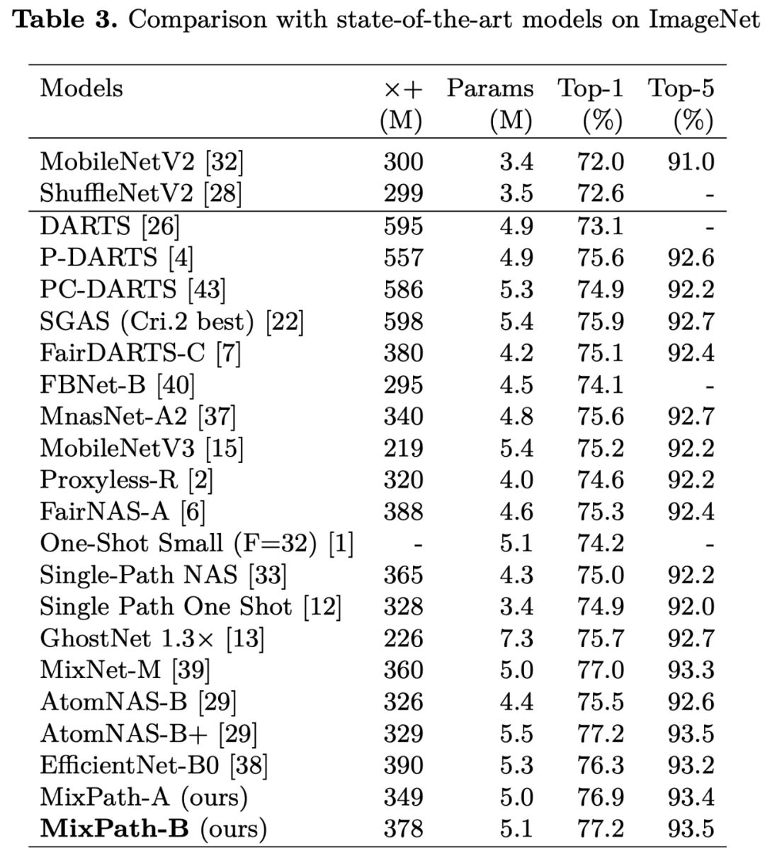 使用本文方法在 ImageNet 进行搜索,将所得模型单独训练后的对比,其中 MixPath-B 准确率最高可达 77.2%: