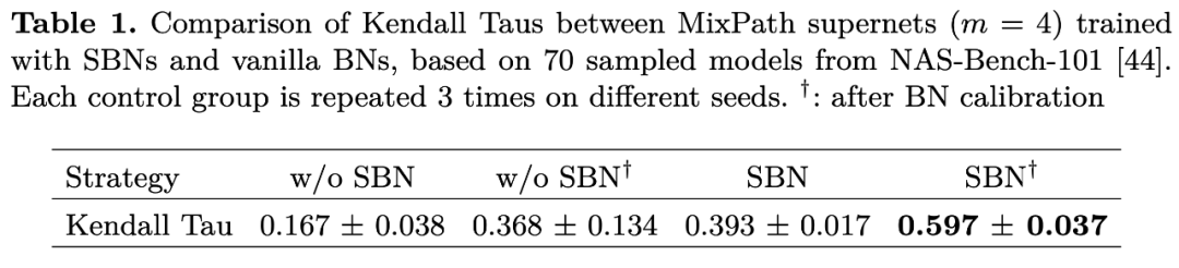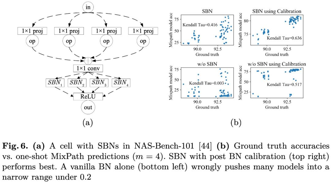 使用本文的方法在 NAS-Bench-101 的子集(以适应 MixPath 搜索空间)上进行验证,测试 ranking 如 Fig 6b,可见 SBN 和 BN 校准操作并用可以最大限度提升超网的排序能力: