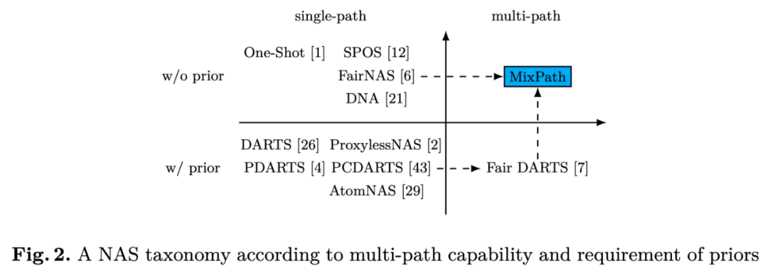 多路径模型可以更好地平衡性能和计算消耗(Inception,ResNeXt)。当前不含先验的神经网络架构搜索方法,缺乏一种和 FairDARTS 多路径方式对偶的搜索方式(Fig 2)。