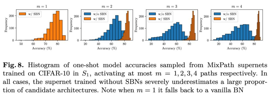 用 SBN 训练的 Supernet 采样子模型比不用 SBN 的分布更好,随机采样 1000 个模型的预测准确率分布(激活 m=1,2,3,4个路径):