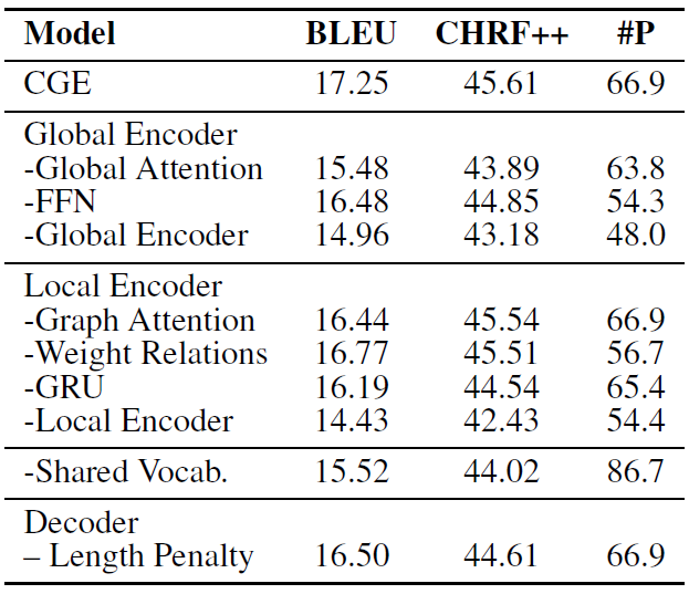 下表是在数据集WebNLG上的实验结果。CGE比之前的最好模型在BLEU值上高5-6个点,在METEOR上高2-3个点,表明其生成文本的拟合度是显著更好的。