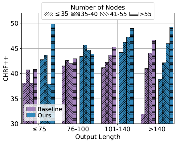 下图是输入结点数量、生成句子长度和效果之间的关系。总的来说,当生成长度一定时,输入结点越多,效果越好,当结点数量较少的时候,基线模型和本文模型都表现得不算好。