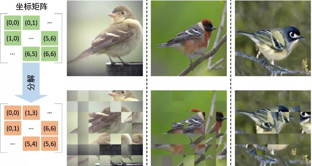 ▲ 图3. 图像按子区域进行解构打乱的示意图(左边是坐标矩阵,代表了每个图像子区域在原图中的横坐标与纵坐标位置;左边是三张图像进行解构打乱前后的展示)