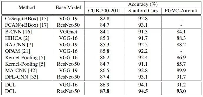 基于 DCL 的算法框架在 CVPR 2019 FGVC 比赛中取得两项第一名(backbone的选择从 ResNet50, SEResNet,ResNeXT 到 SEResNext,均证明了 DCL 的有效性)。分别是: