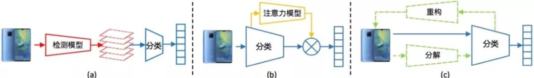 如上图所示,(a) 主要依靠目标物体检测模型从图像中提取目标物体图像与背景图像信息进行区分,然后再基于目标物体图像的特征进行分类。方法 (a) 主要是考虑去掉背景信息对于物体分类带来的干扰。