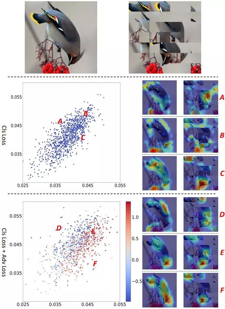 ▲ 图4. 不同卷积核对原始图片和解构后图片的响应对比。第一行是原始图像和解构后的图像。下面两行的左侧分别对应的是使用特征对抗模块前后的的不同卷积核对原始和解构后图像的响应(横坐标表示原始图像上的响应值,纵坐标表示解构后图像上的响应值)。右侧是来自不同卷积核的可视化特征图,这些卷积核对原始图像和破坏图像有不同的响应。A,D:对于解构后图像响应较大的卷积核,对杂乱的边缘噪声响应比较大;C,F:对原始图像响应较大的卷积核,比如对鸟的总体轮廓响应比较大,更关注于物体的整体轮廓;B,E:对原始图像与解构后图像都有大响应的卷积核,更关注与物体的局部精细特征,比如鸟的翅膀或者头部。