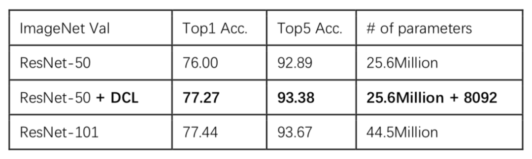 另外我们还将 DCL 算法拓展到通用物体识别任务中。实验结果表明,在只新增 8092 个参数(相当于 ResNet-50 的 0.03% 的参数规模)的情况下,基于 DCL 的方法在 ImageNet-1K 任务上可以将 ResNet50 的性能提升至 ResNet-101 的水准。