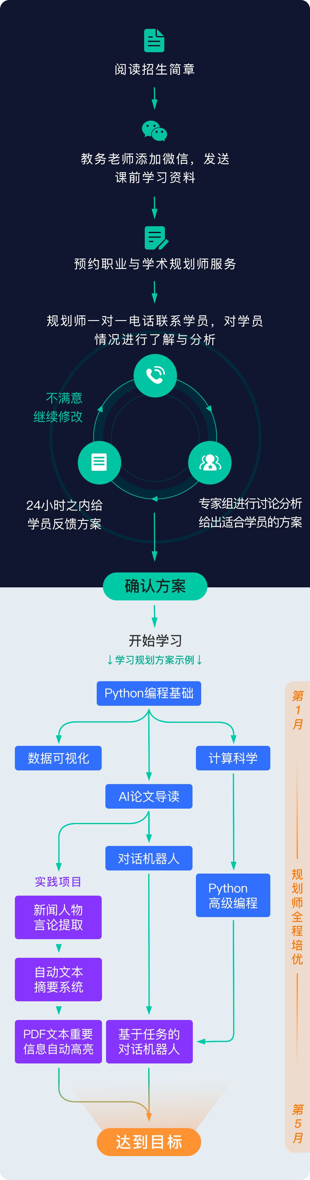 因为学院现在开设的课程内容众多,不同的同学背景有所区别。我们的课程模式,做了重大升级。在课程、项目保证的同时,我们还新增设了职业与学术规划师全程培优服务,规划师会对学员进行一对一的深度沟通,然后职业与学术规划委员会进行讨论分析,24小时内制定学员专属方案,不满意继续修改。学员确定方案后,即可开始我们的学习,直到学员顺利毕业。