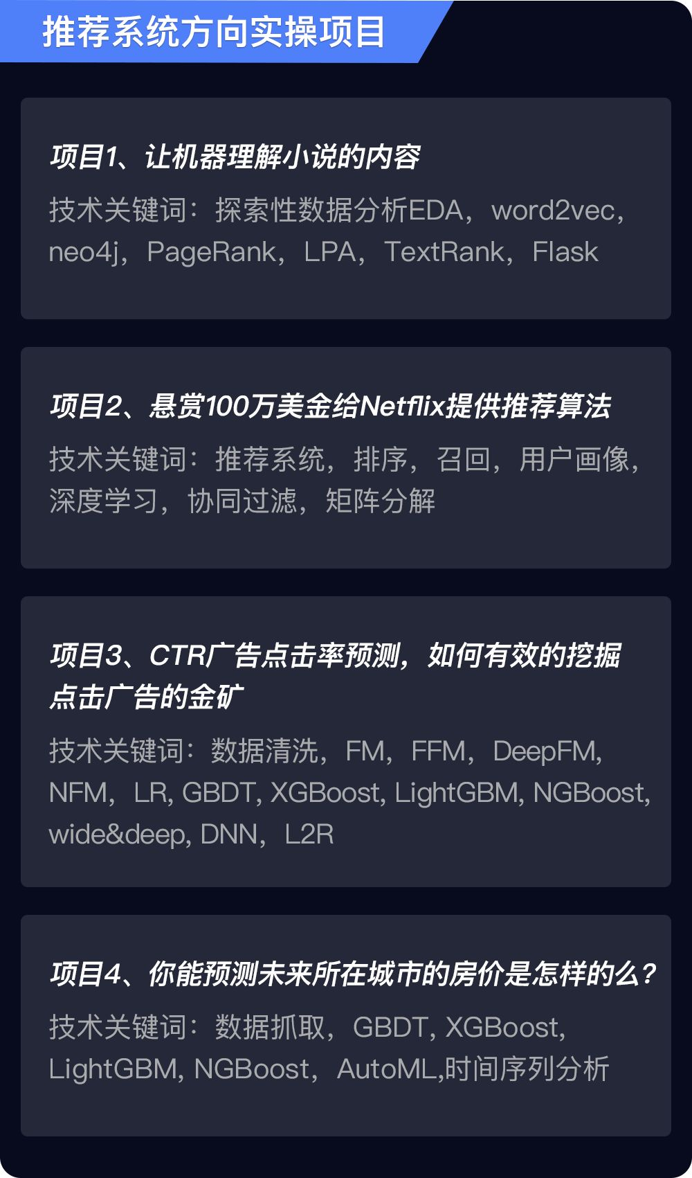 推荐系统(Recommender System,RS)方向,主要面向希望从事数据挖掘,推荐系统工程师相关的学员。推荐系统目前主要用于解决筛选大量信息的问题,推荐的对象包括(图片、视频等)内容/商品/信息查询,也有一些推荐系统专门寻找人/服务/信息等对象。