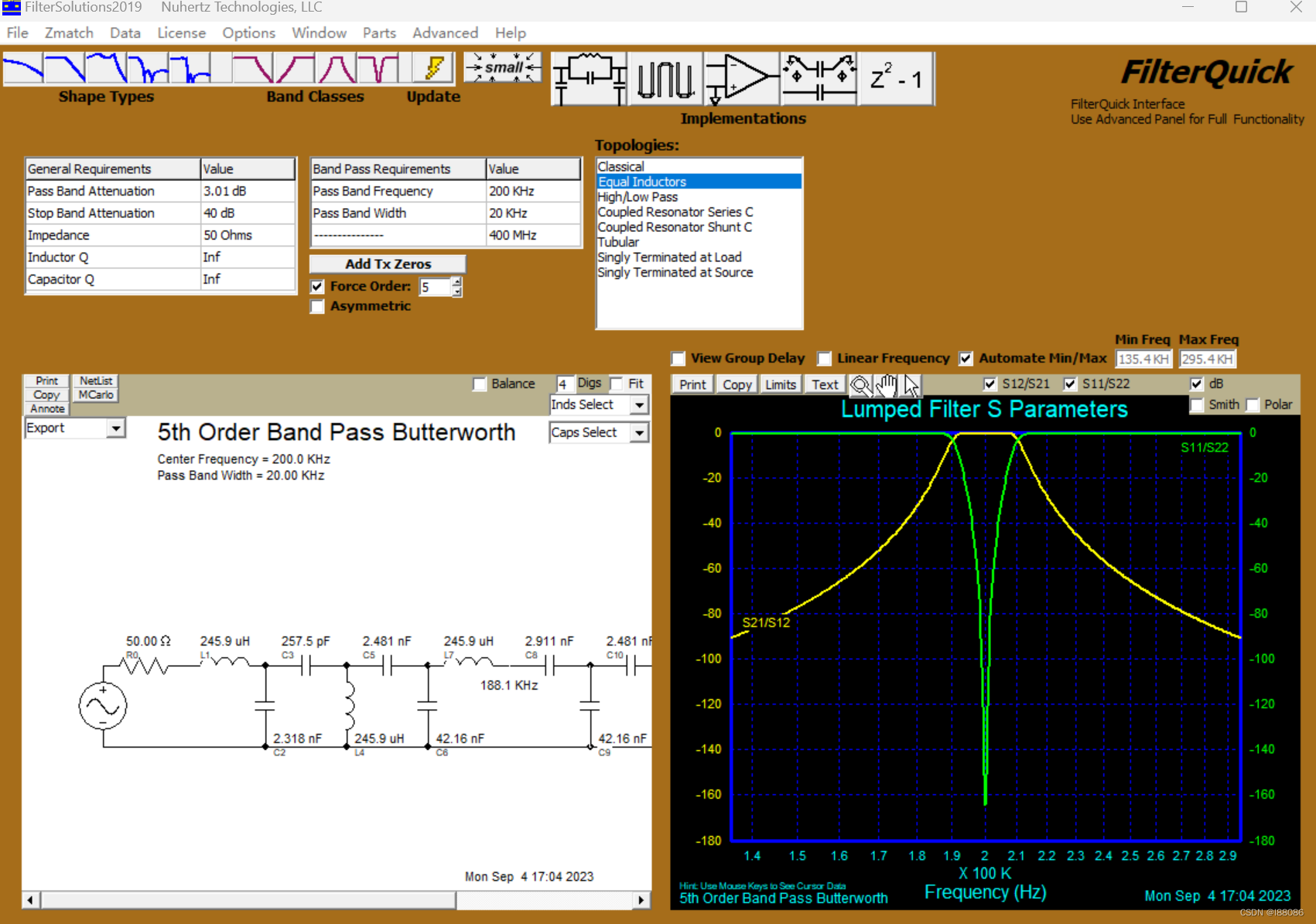 左上角选择滤波器的形状,类型左边表格能够调整滤波器的参数,第一项为通带衰减,这里3dB意思是通带内的衰减不超过3dB,第二项是阻带衰减,意思与前者相似,第三项为阻抗,意思是你这个滤波器设计时的匹配阻抗是多少,一般为50欧姆。再下面两项是电感电容的q值,主要是影响插入损耗,一般理论设计时考虑较少,基本可设为无穷。中间表格第一项为通带频率,指的是你希望通过去的信号的中心频率,这里选择的时200KHz。第二项是通带宽度,指的是你希望在中心频点两边多大的范围内,信号能过去。最右边为选择滤波器的电路模型,这个看实际情况选择,由于本次设计需要绕制电感,我选择了等电感模型。最后下面有个force order,指的是固定滤波器的阶数,其主要影响带内是否平整,带外下降的速度。选择你需要的滤波器形状,类型以及各个参数过后,点击小闪电便可在左下一键生成滤波器电路。