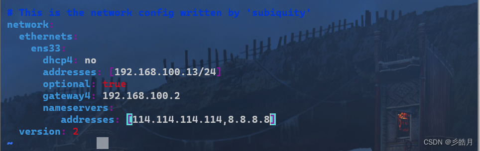 network:ethernets:ens33:dhcp4: noaddresses: [192.168.100.13/24]optional: truegateway4: 192.168.100.2nameservers:addresses: [114.114.114.114,8.8.8.8]version: 2