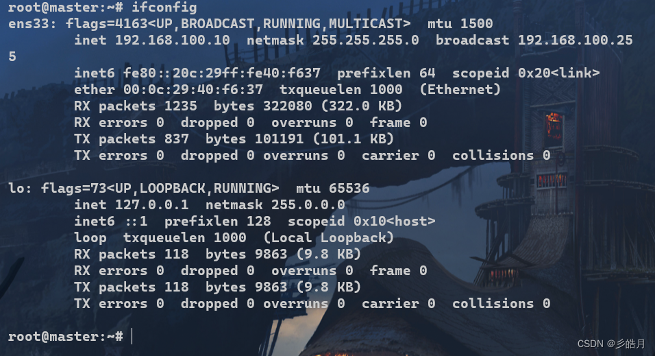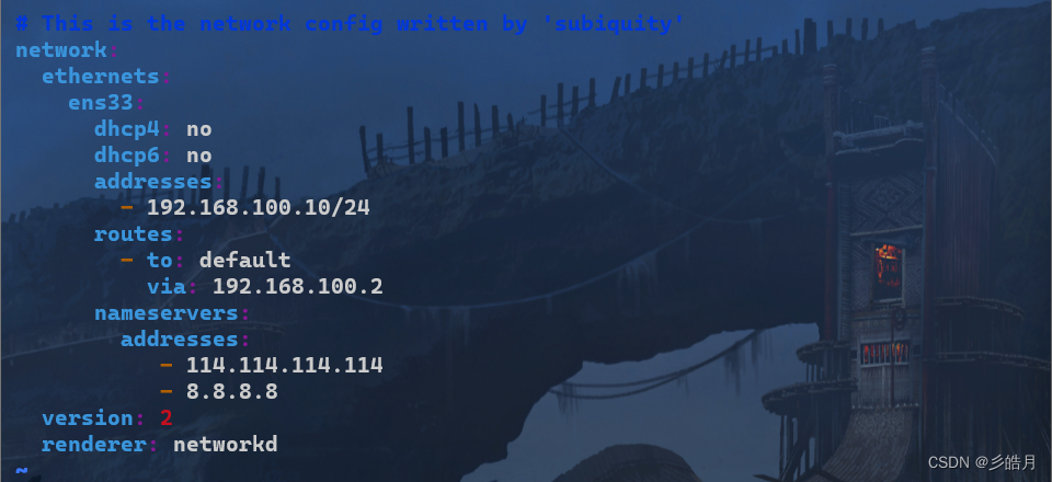 network:ethernets:ens33:dhcp4: nodhcp6: noaddresses:- 192.168.100.10/24routes:- to: defaultvia: 192.168.100.2nameservers:addresses:- 114.114.114.114- 8.8.8.8version: 2renderer: networkd