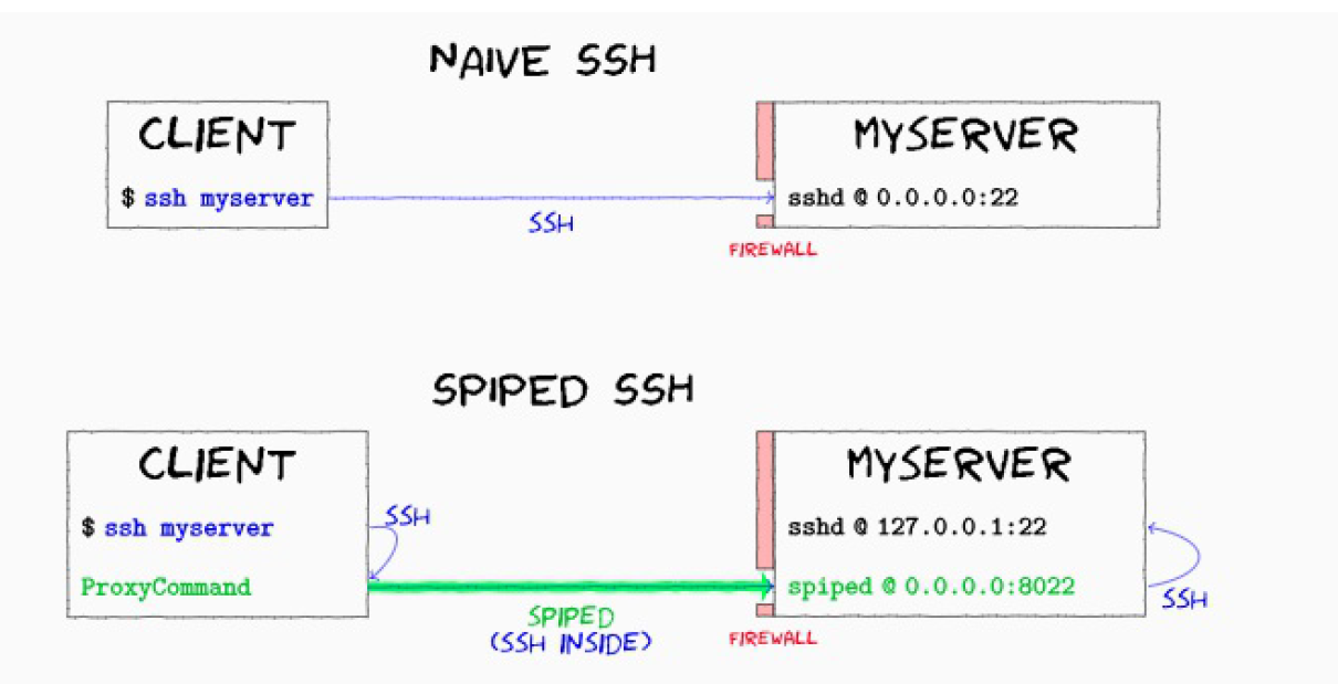 SSL 代理比较常见的有 ssh,不过 Redis 官方推荐使用 spiped 工具,可能是因为 spiped 的功能相对比较单一,使用也比较简单,易于理解。同样 SSL 代理也可以用在主从复制上,如果 Redis 主从实例需要跨机房复制,spiped 也可以派上用场。下面这张图是使用 spiped 对 ssh 通道进行二次加密 (因为 ssh 通道也可能存在 bug)。