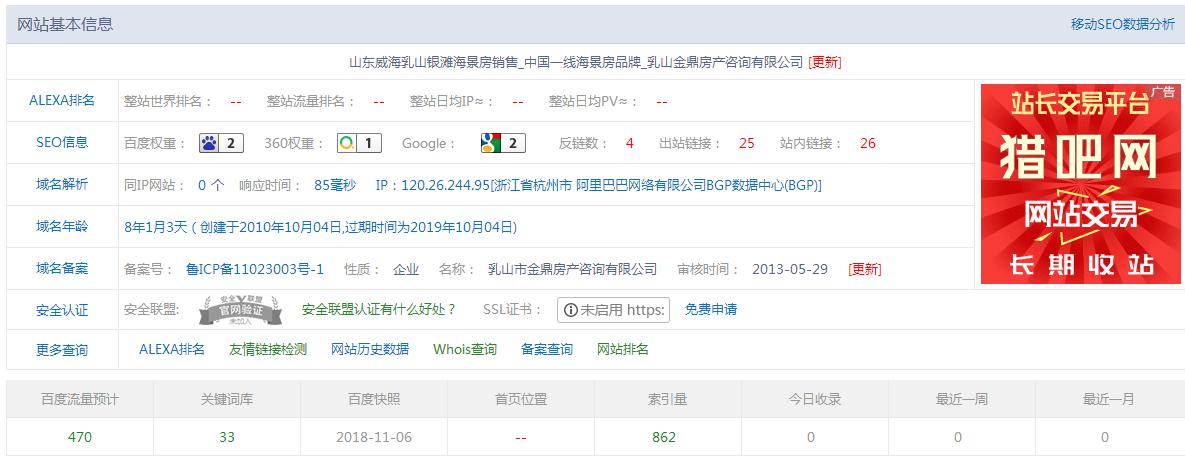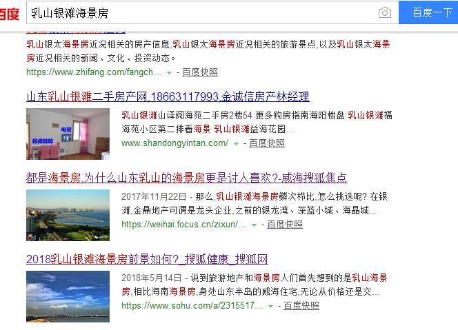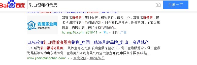 先看一下搜索乳山银滩海景房的百度展示,第一条自然排名就是金鼎地产